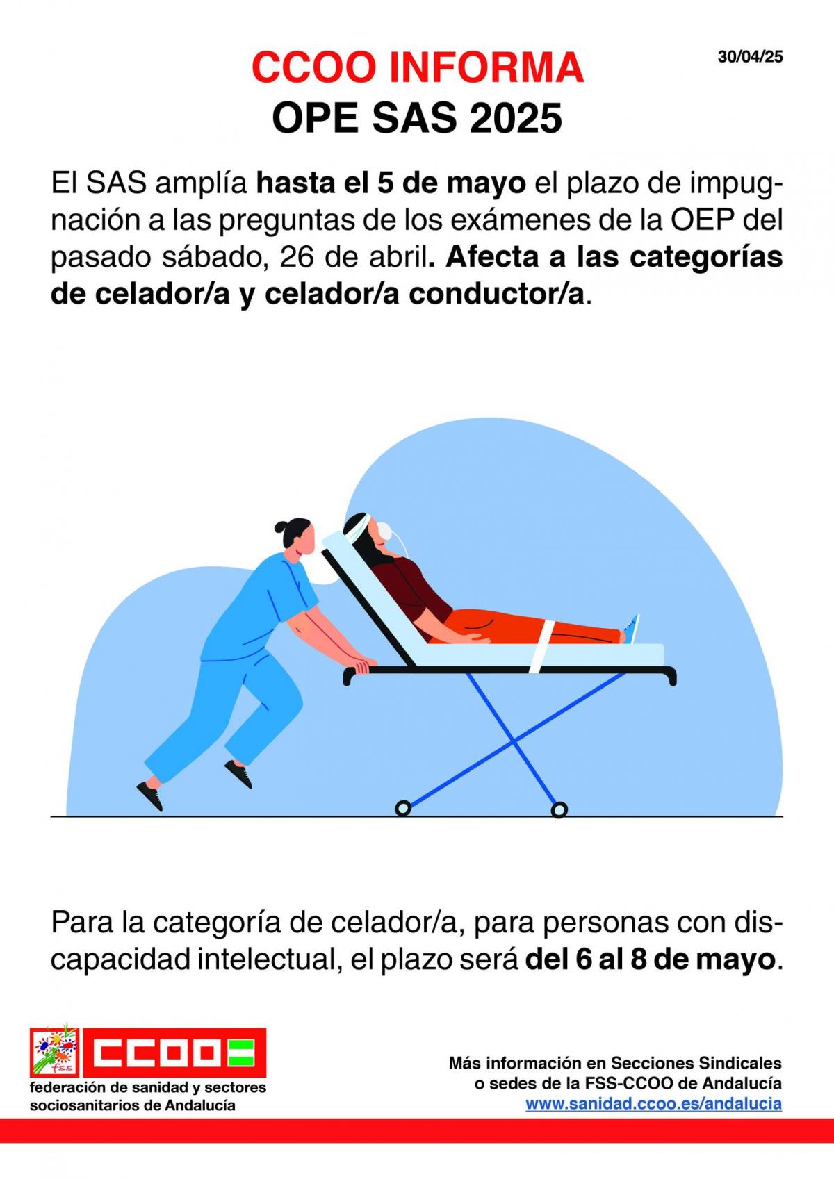 La Federación de Sanidad y Sectores Sociosanitarios de CCOO de Andalucía informa que se ha publicado en la web del SAS del día 12 de noviembre la resolución con el nuevo listado provisional incrementado con la categoría de Podología, puntuación mínima para formar parte del listado de contratación 30 puntos en turno libre.