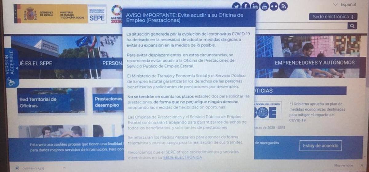 El Ministerio de Trabajo y Servicio Público de Empleo ha hecho público que no se tendrán en cuenta los plazos establecidos para solicitar prestaciones. De esta forma se pretende garantizar los derechos de las personas que solicitan o sean beneficiarias de prestaciones y evitar el desplazamiento a las oficinas mientras dure la crisis generada por el COVID. Además anuncia que se reforzarán las atenciones telemáticas. Más información web del SEPE http://sepe.es/HomeSepe